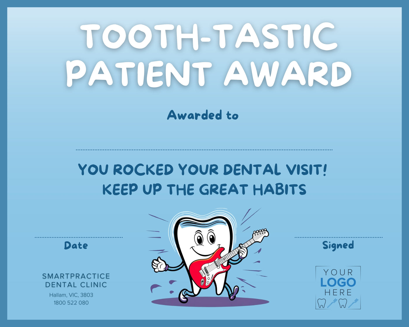 { "id":9726521835806, "title":"Tooth-tastic Patient Award (100 Pack)","handle":"tooth-tastic-patient-award-50-pack", "description":"\u003cp\u003eCelebrate dental health milestones with our recognition awards! Reward youngsters for their bravery and encourage them to maintain excellent oral health.\u003c\/p\u003e\n\u003cul\u003e\n\u003cli\u003eFREE Personalisation\u003c\/li\u003e\n\u003cli\u003eAward Size: 8\" x 10\"\u003c\/li\u003e\n\u003cli\u003e100 Pack\u003c\/li\u003e\n\u003c\/ul\u003e", "published_at":"2025-04-07T09:36:21", "created_at":"2025-03-14T13:44:41", "vendor":"SmartPractice Australia", "type":"Dental", "tags":["Certificates \u0026 Awards","Dental Kid's Giveaways","Dental Promotional Products \u0026 Giveaways","Personalised","Promotional Products \u0026 Giveaways","Toys \u0026 Games"], "price":8000, "price_min":8000, "price_max":8000, "price_varies":false, "compare_at_price":0, "compare_at_price_min":0, "compare_at_price_max":0, "compare_at_price_varies":false, "all_variant_ids":[49660999696670], "variants":[{"id":49660999696670,"title":"Default Title","option1":"Default Title","option2":null,"option3":null,"sku":"SPA007","requires_shipping":true,"taxable":true,"featured_image":null,"available":true,"name":"Tooth-tastic Patient Award (100 Pack)","public_title":null,"options":["Default Title"],"price":8000,"weight":100,"compare_at_price":0,"inventory_management":"shopify","barcode":null,"requires_selling_plan":false,"selling_plan_allocations":[]}], "available":null,"images":["\/\/smartpractice.com.au\/cdn\/shop\/files\/Tooth-tasticPatientAward.jpg?v=1741920289"],"featured_image":"\/\/smartpractice.com.au\/cdn\/shop\/files\/Tooth-tasticPatientAward.jpg?v=1741920289", "options":["Title"], "url":"\/products\/tooth-tastic-patient-award-50-pack"}